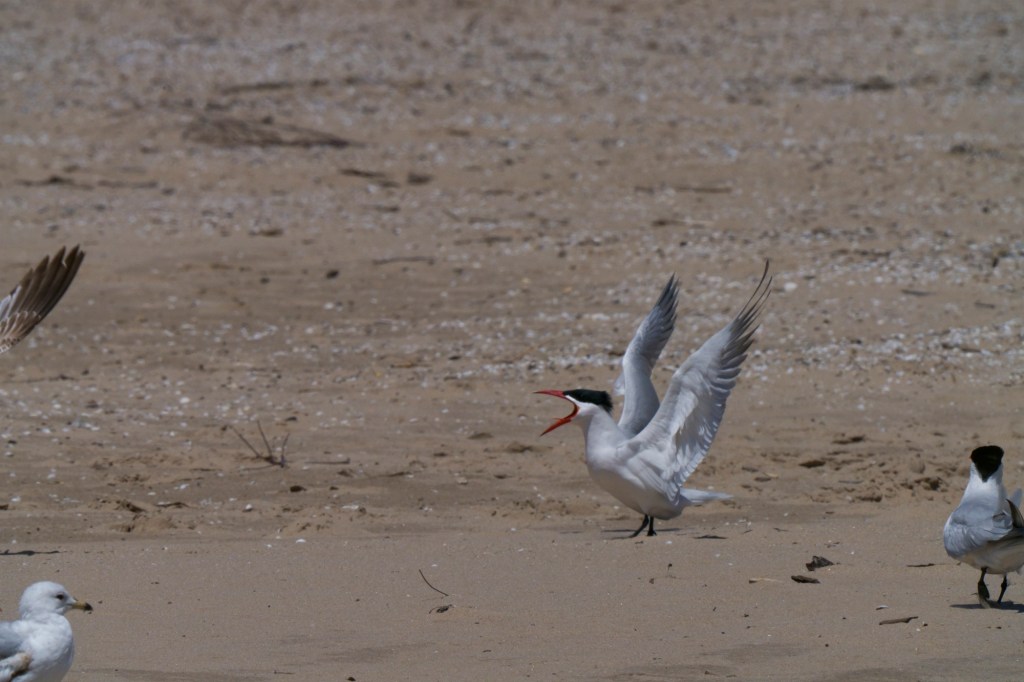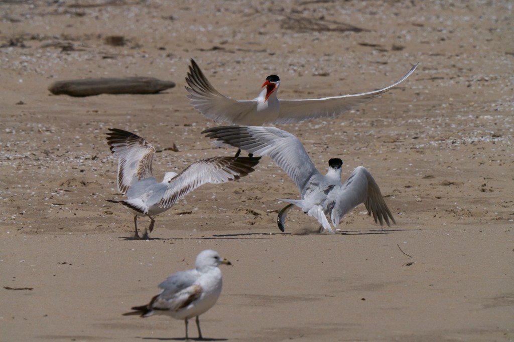 6574 drive 11A Caspian Tern courts its mate by bringing it a fish. 6575 drive 11A pair of Caspian Terns drop a fish as a Gull attacks them. 6576 drive 11A Caspian Tern screams a a Gull leaves after stealing its fish. 6577 drive 11A pair of Caspian Terns scream as a Gull steals away its fish. 6578 drive 11A Ring-billed Gull flies away with a fish after stealing it from a pair of Caspian Terns.